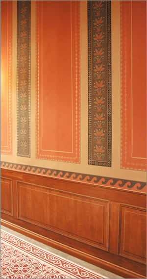 - Retusche und Rekonstruktion der historischen Raumfassungen, Muster und Ornamente nach Befund